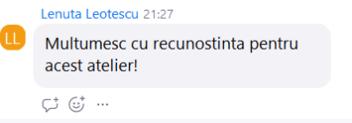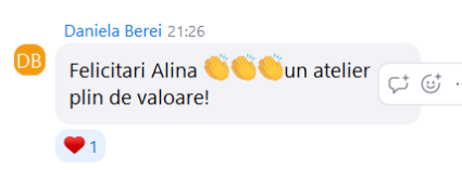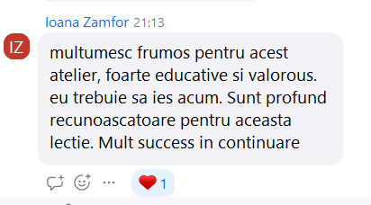 - Satifsacție și bucurie pentru că ceea ce fac e o reală contribuție în viețile participanților sesiunilor mele. Mesajele de mulțumire îmi confirmă că ceea ce fac e bine. Dau valoare celor care participă la workshop-urile mele. Îi ajut cu adevărat.